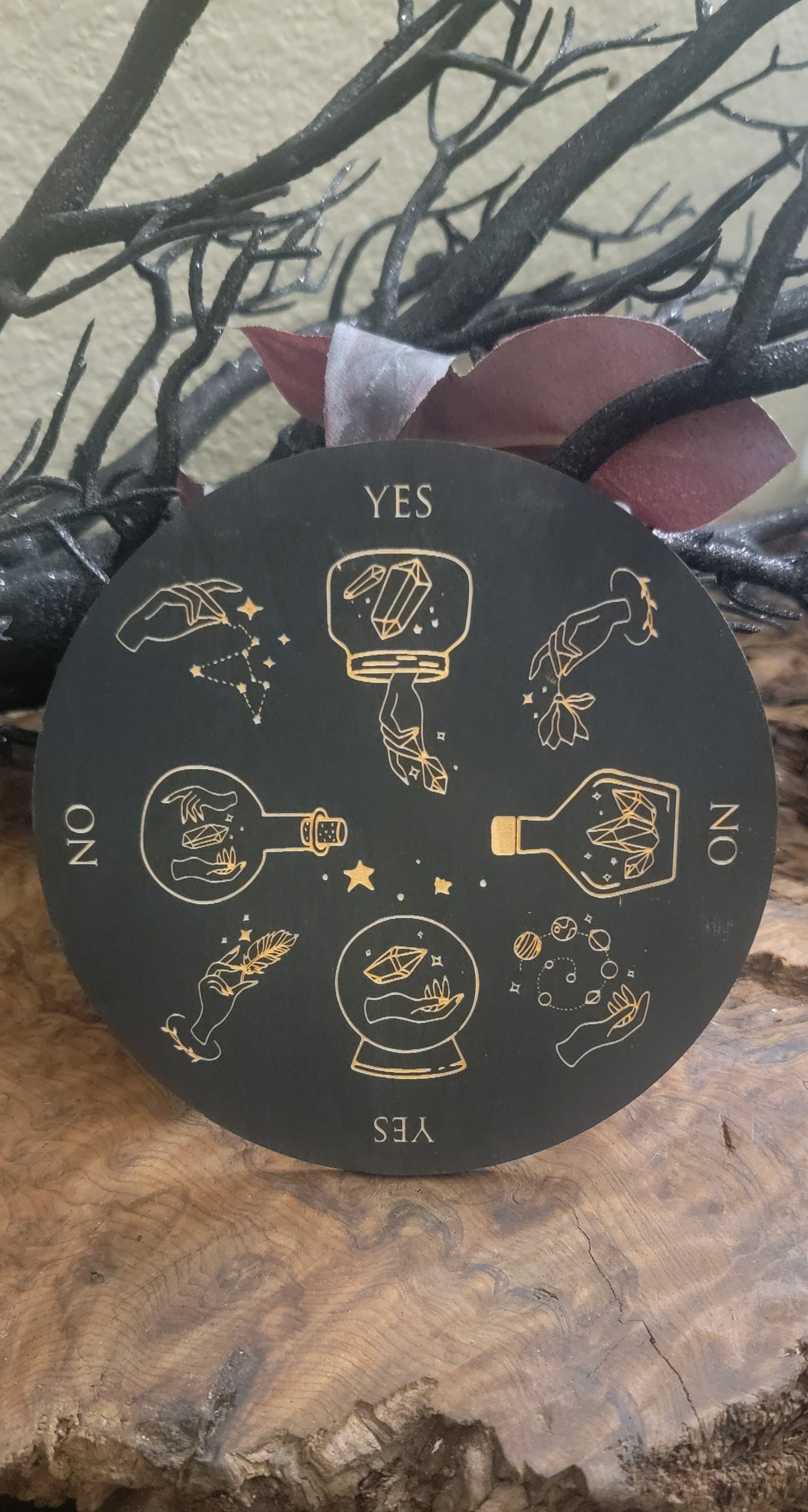 Made of durable black-stained wood, it features Yes / No / Maybe / Rephrase indicators to guide your pendulum readings. Whether you're working with spells, seeking intuitive answers, or enhancing your witchy decor, this board serves as a practical and mystical companion.