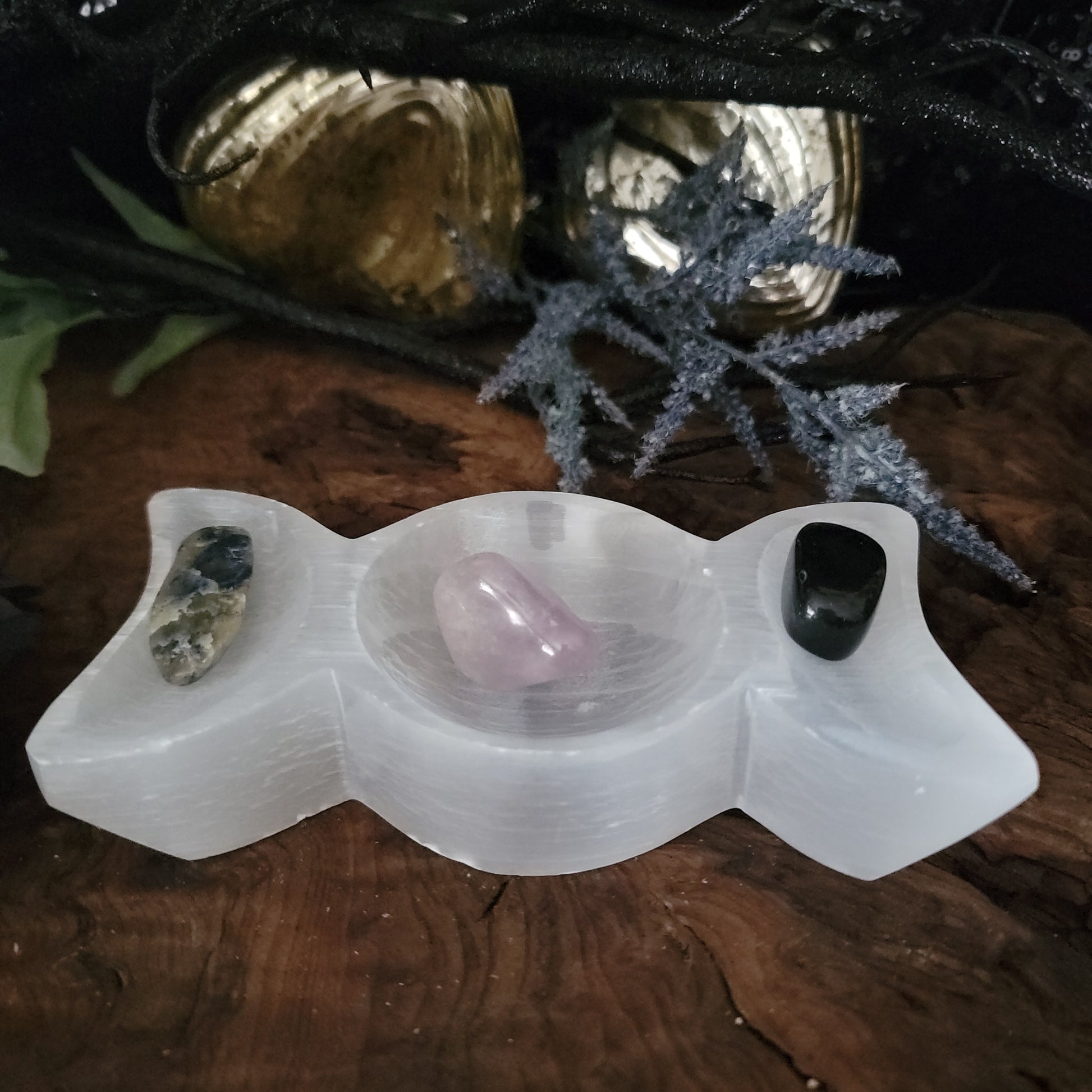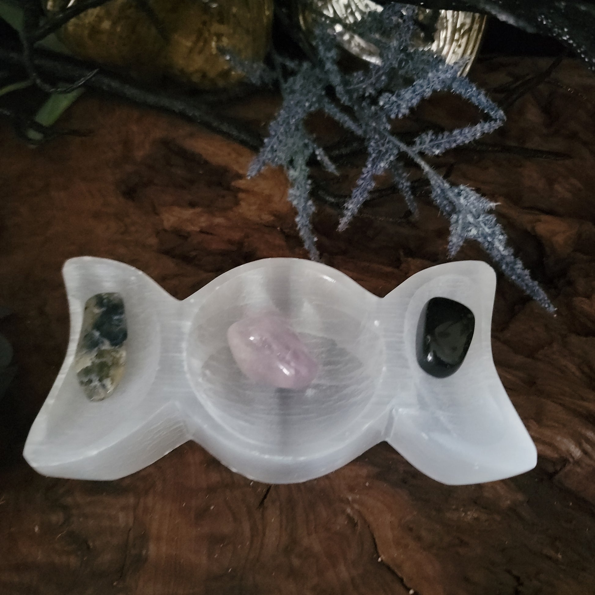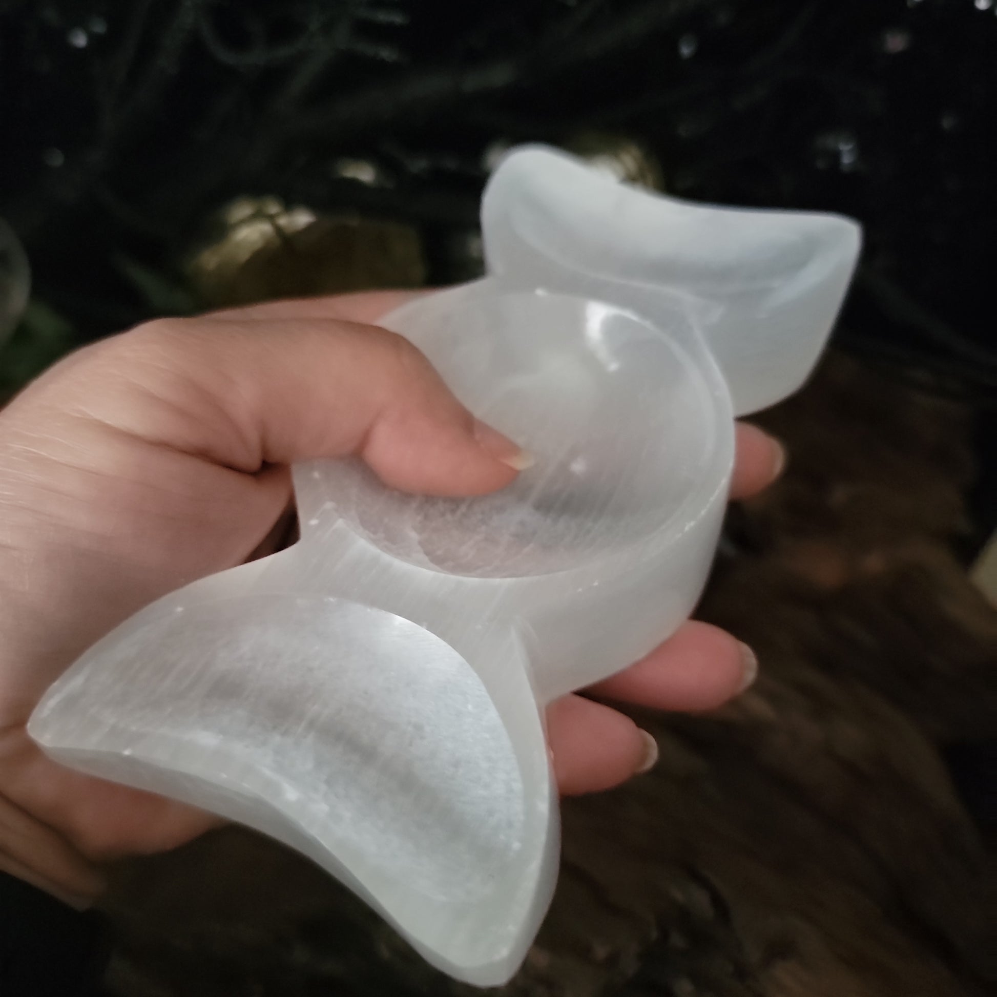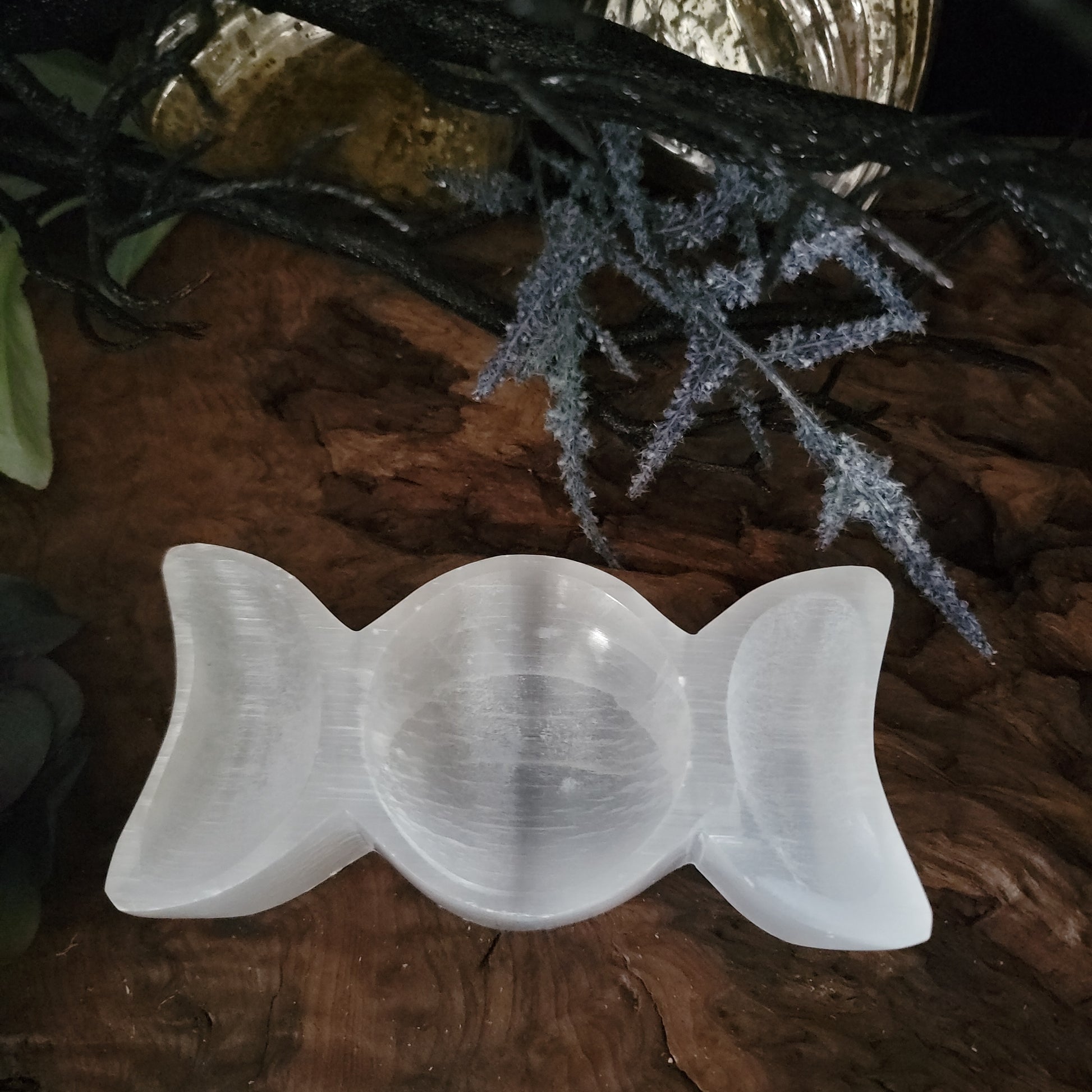Selenite Triple Moon Offering Bowl – Hecate Altar Charging Dish