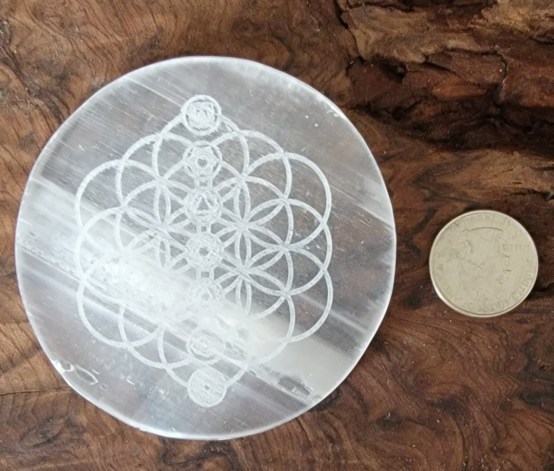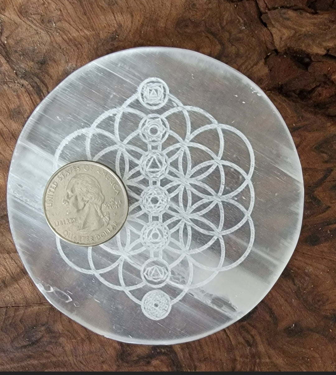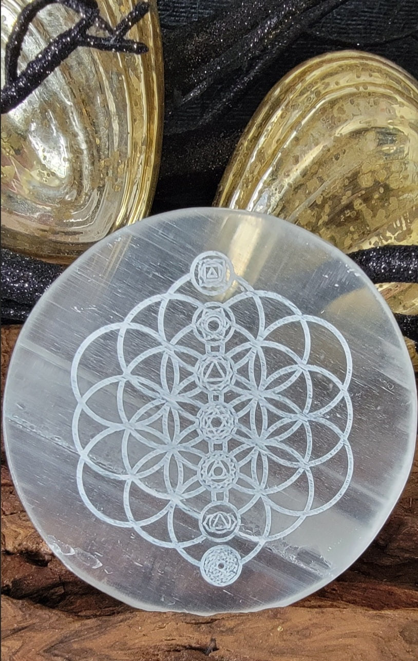 Connect to universal energy with our Selenite Flower of Life Chakra Plate, a powerful tool for spiritual healing and energy alignment. Etched with the Flower of Life sacred geometry and 7 chakra symbols, this polished selenite 2.7" to 3" round plate is perfect for charging crystals, aligning chakras, and enhancing meditation practices.