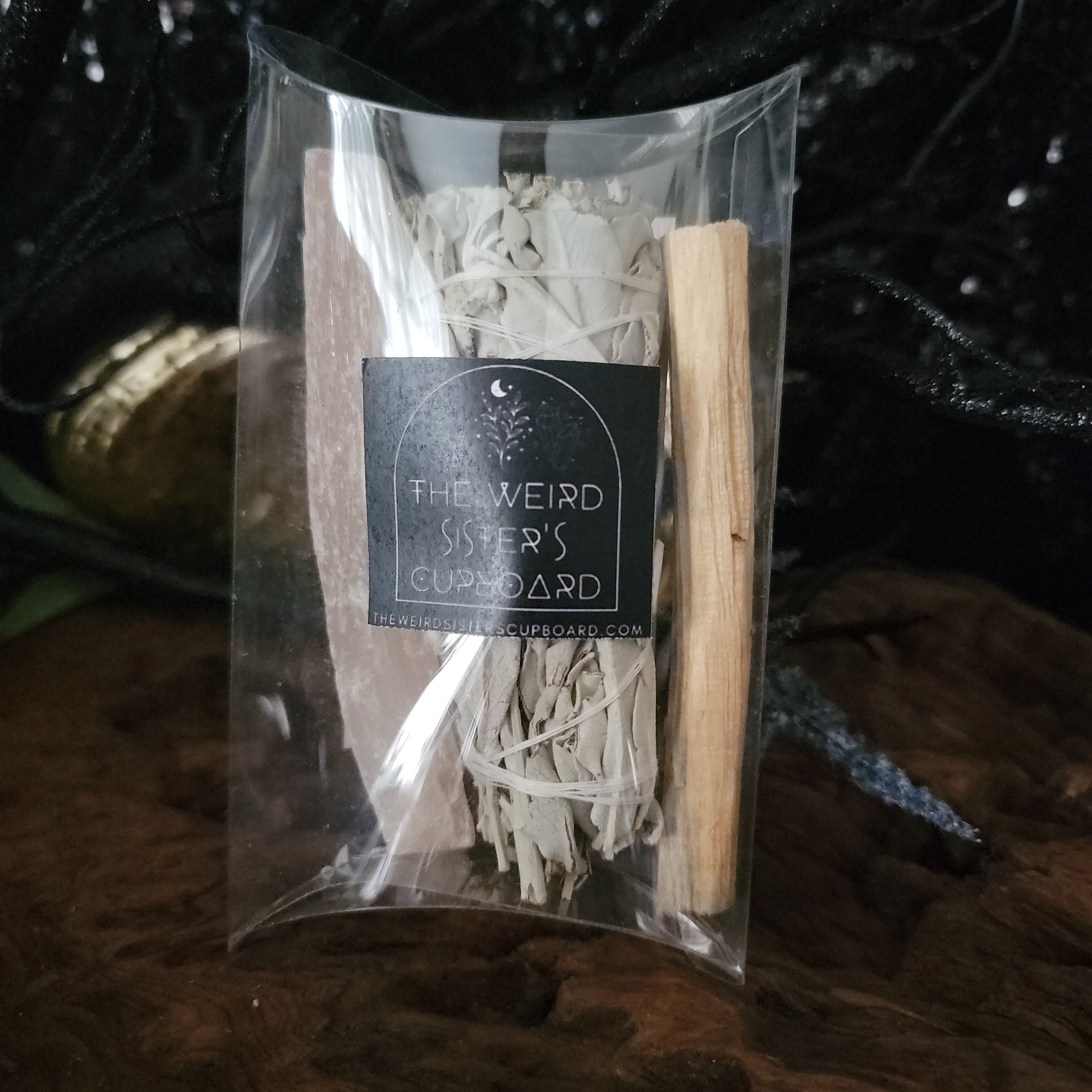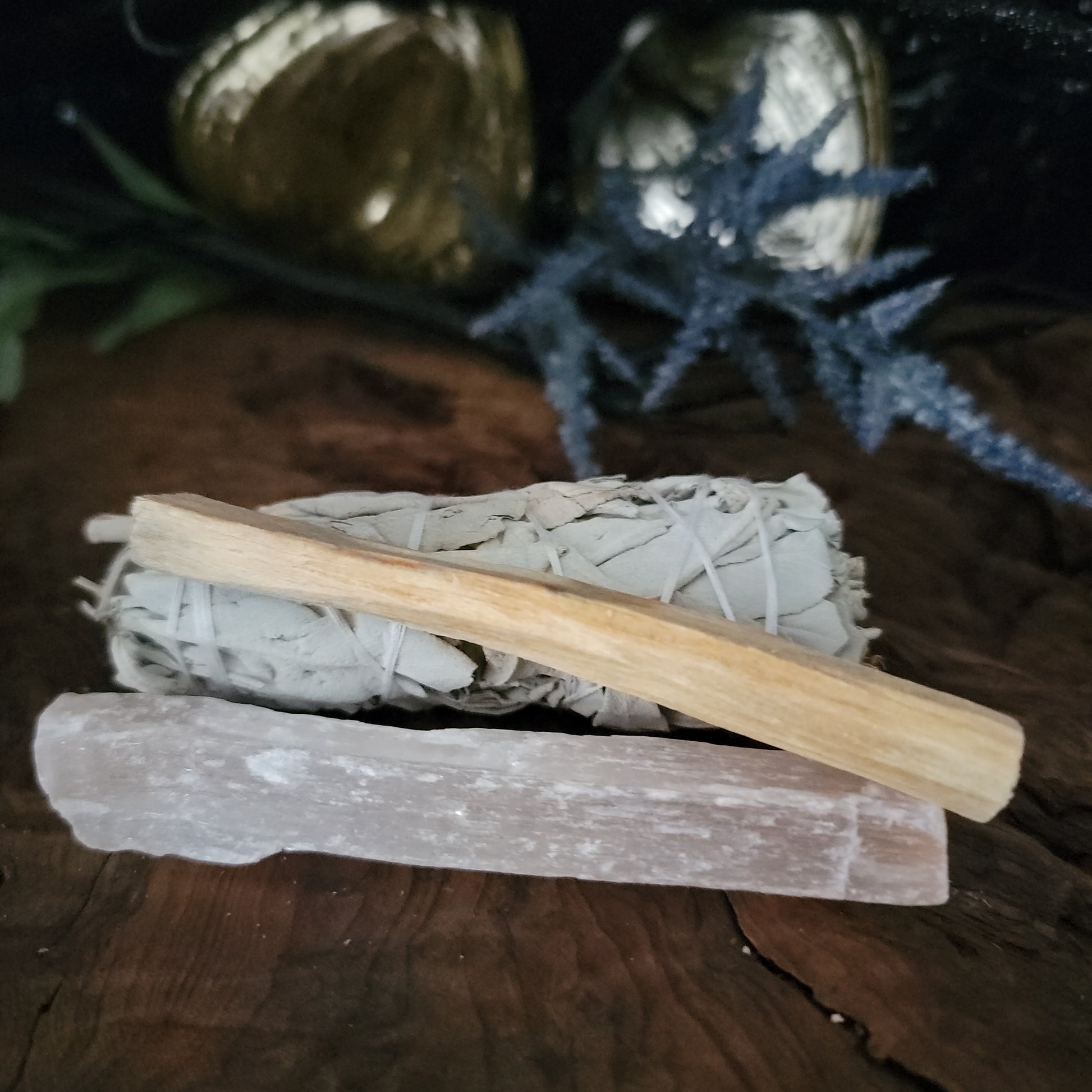 This spiritual cleansing bundle combines the elemental power of White Sage, Palo Santo, and Peach Selenite—a trio known for clearing negative energy, uplifting vibrations, and bringing calm clarity to your space or self.