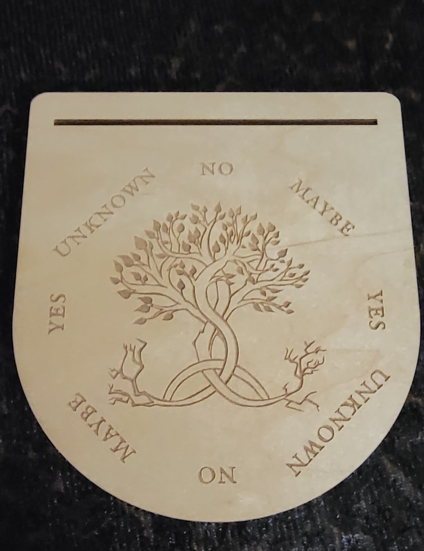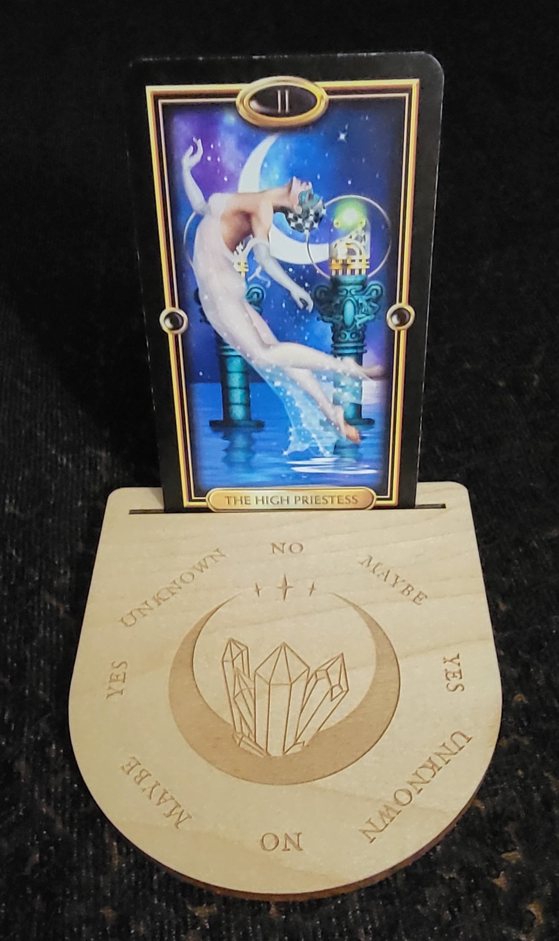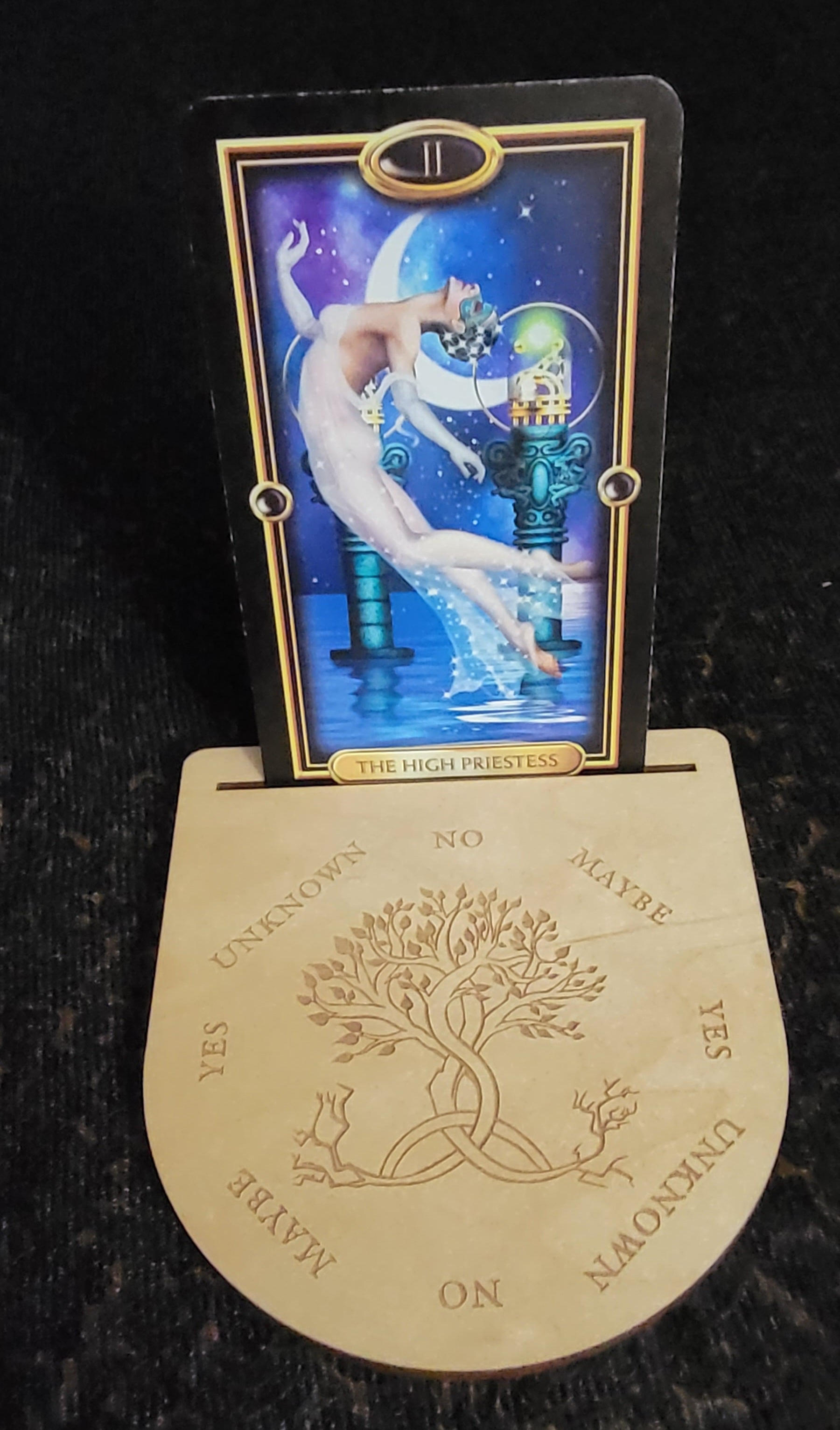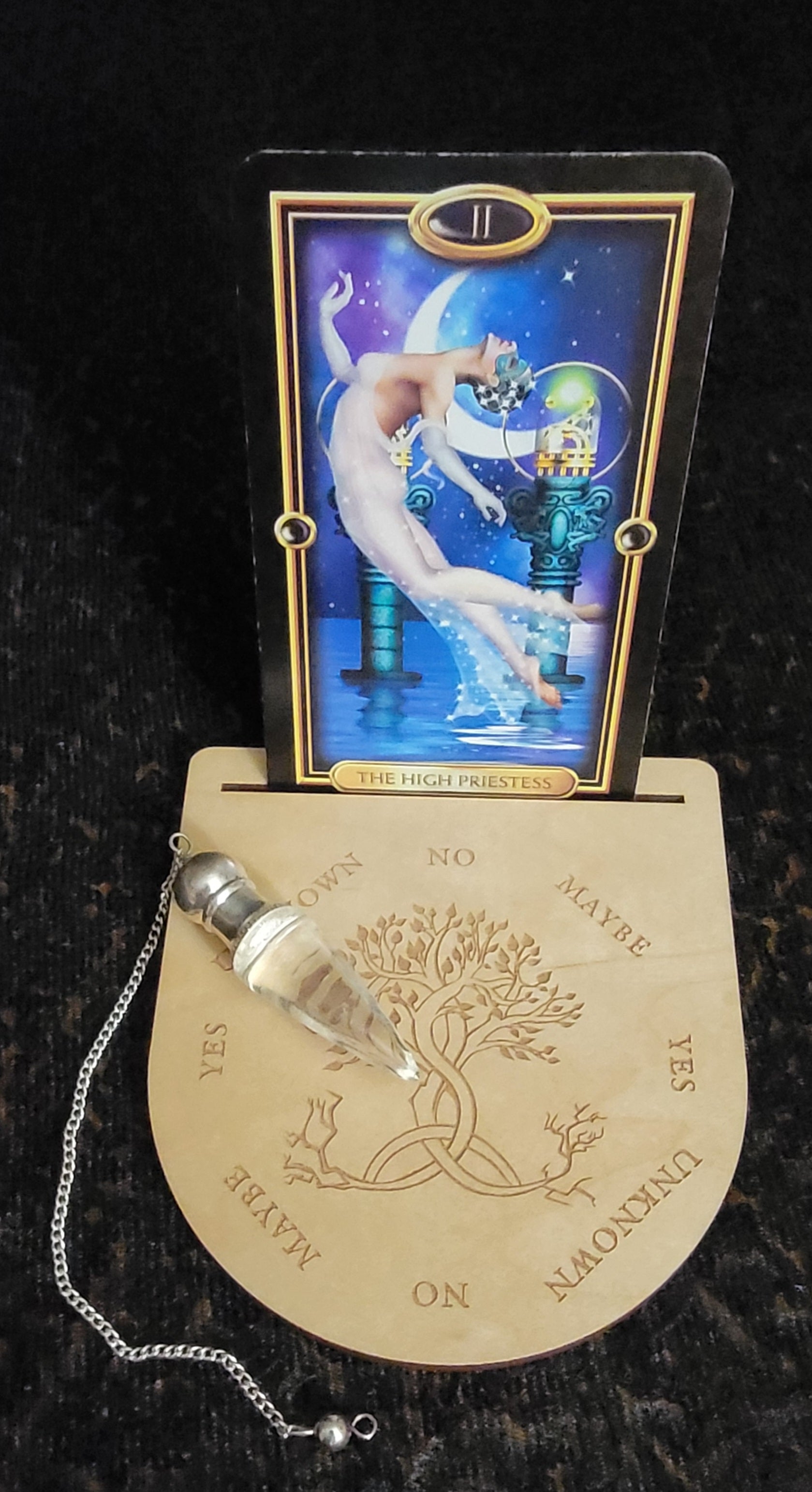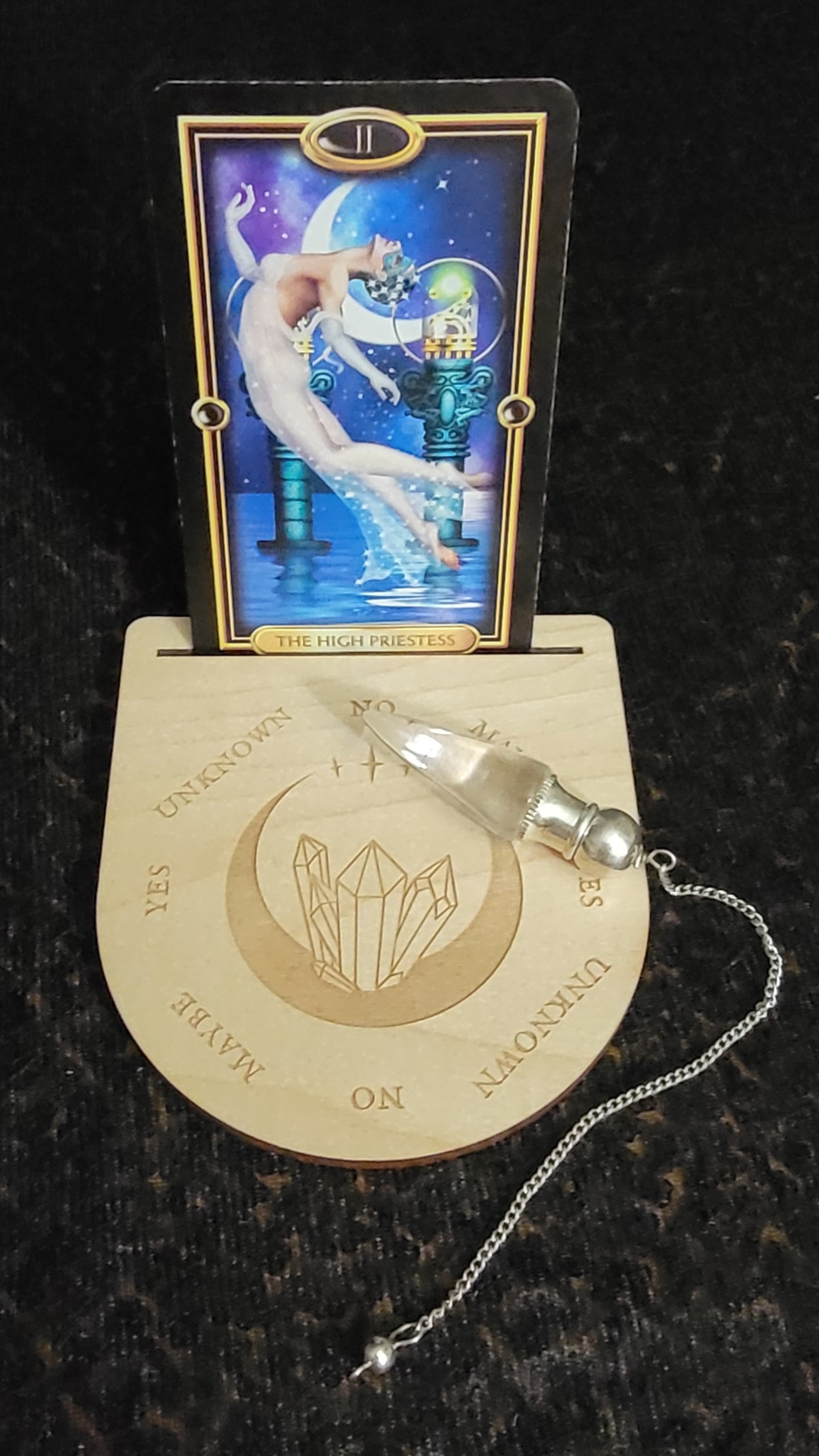 Designed to display one tarot or oracle card, the holder also features an engraved pendulum board with “yes,” “no,” “maybe,” and directional answers—making it ideal for dowsing, intention work, and rituals.