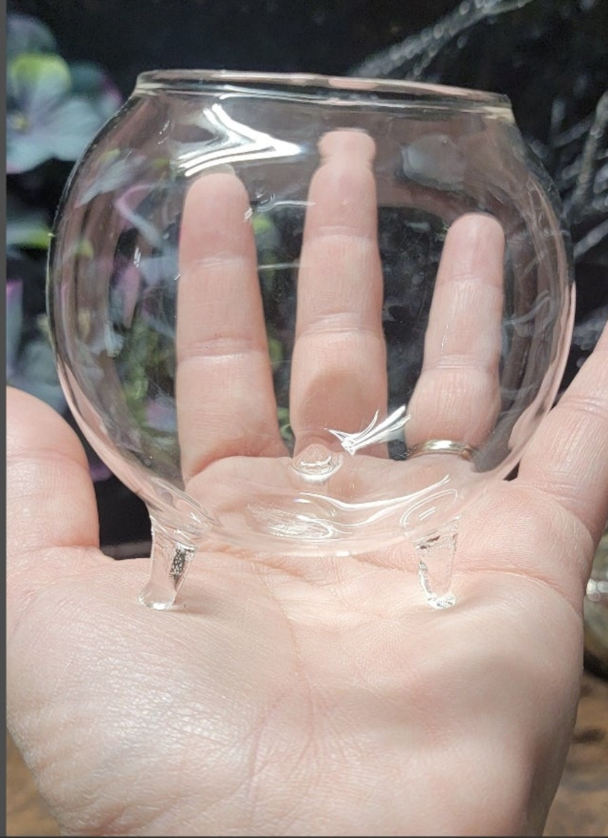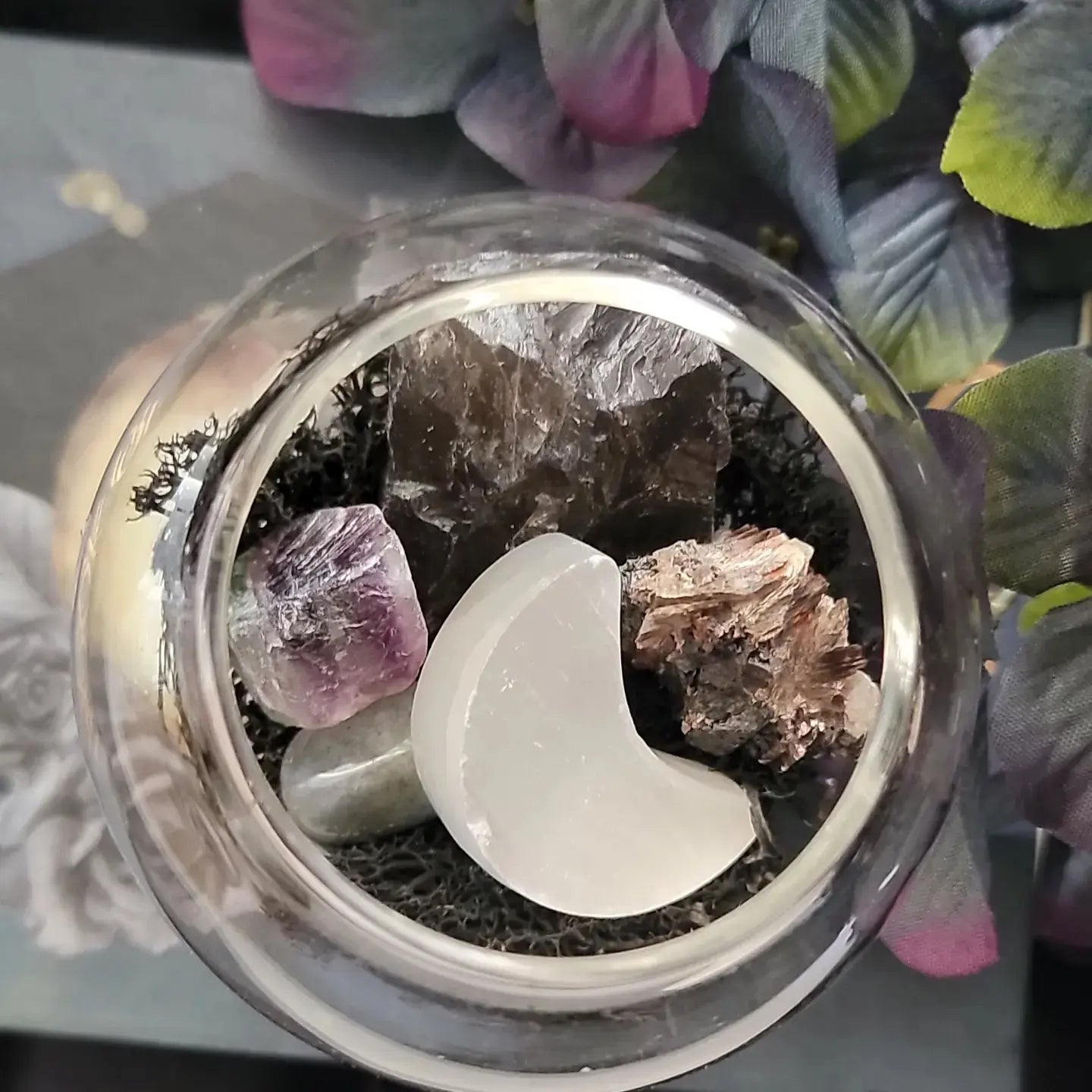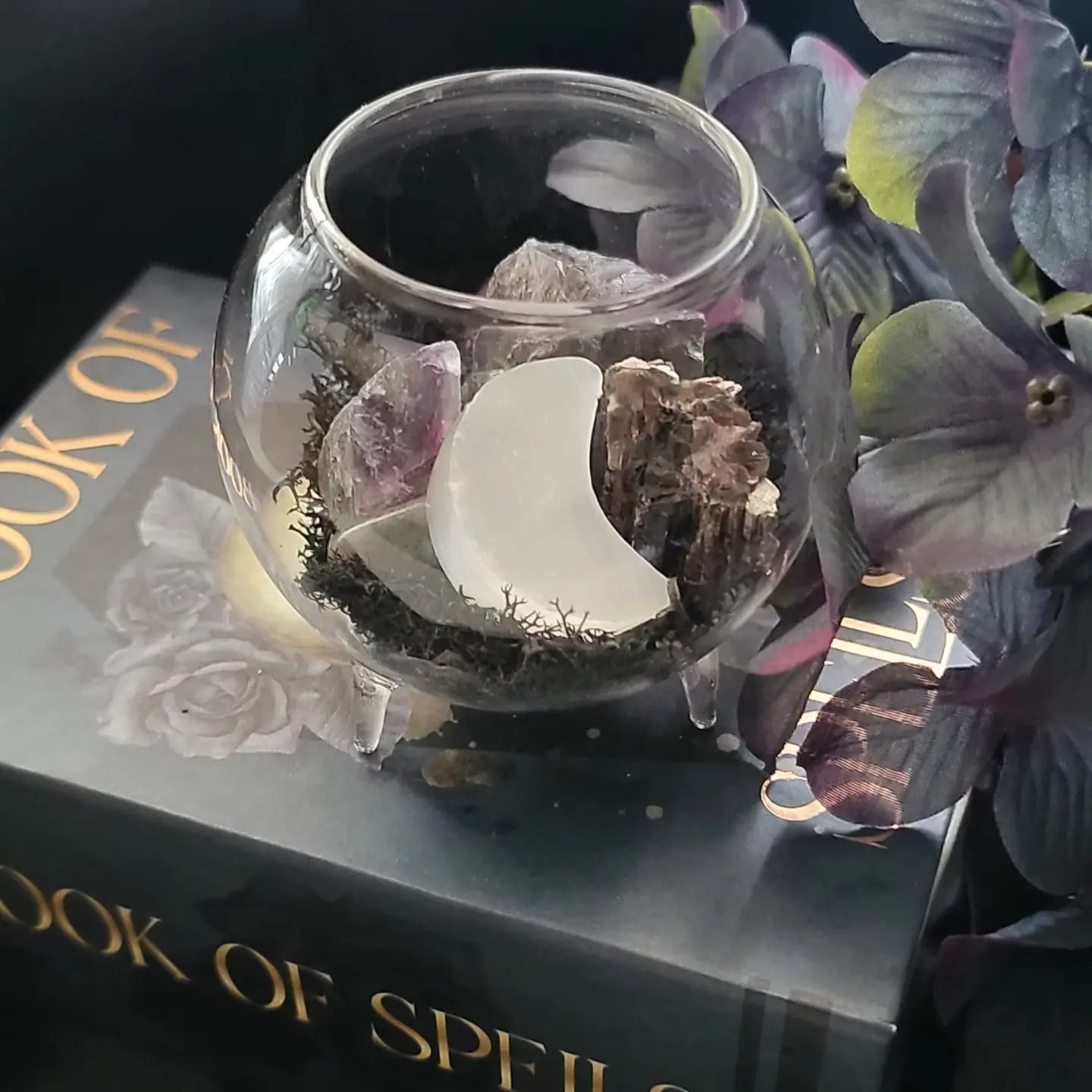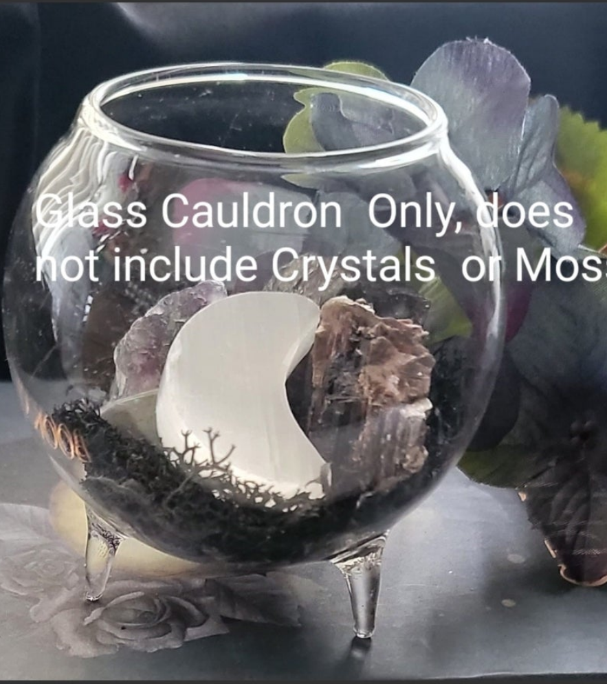 Bring a touch of magic into your space with this 3" round Glass Cauldron Crystal Terrarium, a beautifully curated spell-in-a-jar styled for modern witches and spiritual seekers. Each mini cauldron is carefully filled with intention-charged healing crystals, and protective elements designed to attract positivity, balance, and spiritual grounding. A Selenite Moon and Protection Crystals (Smoky Quartz, Labradorite, Fluorite and Black Tourmaline) on a bed of Black Moss.