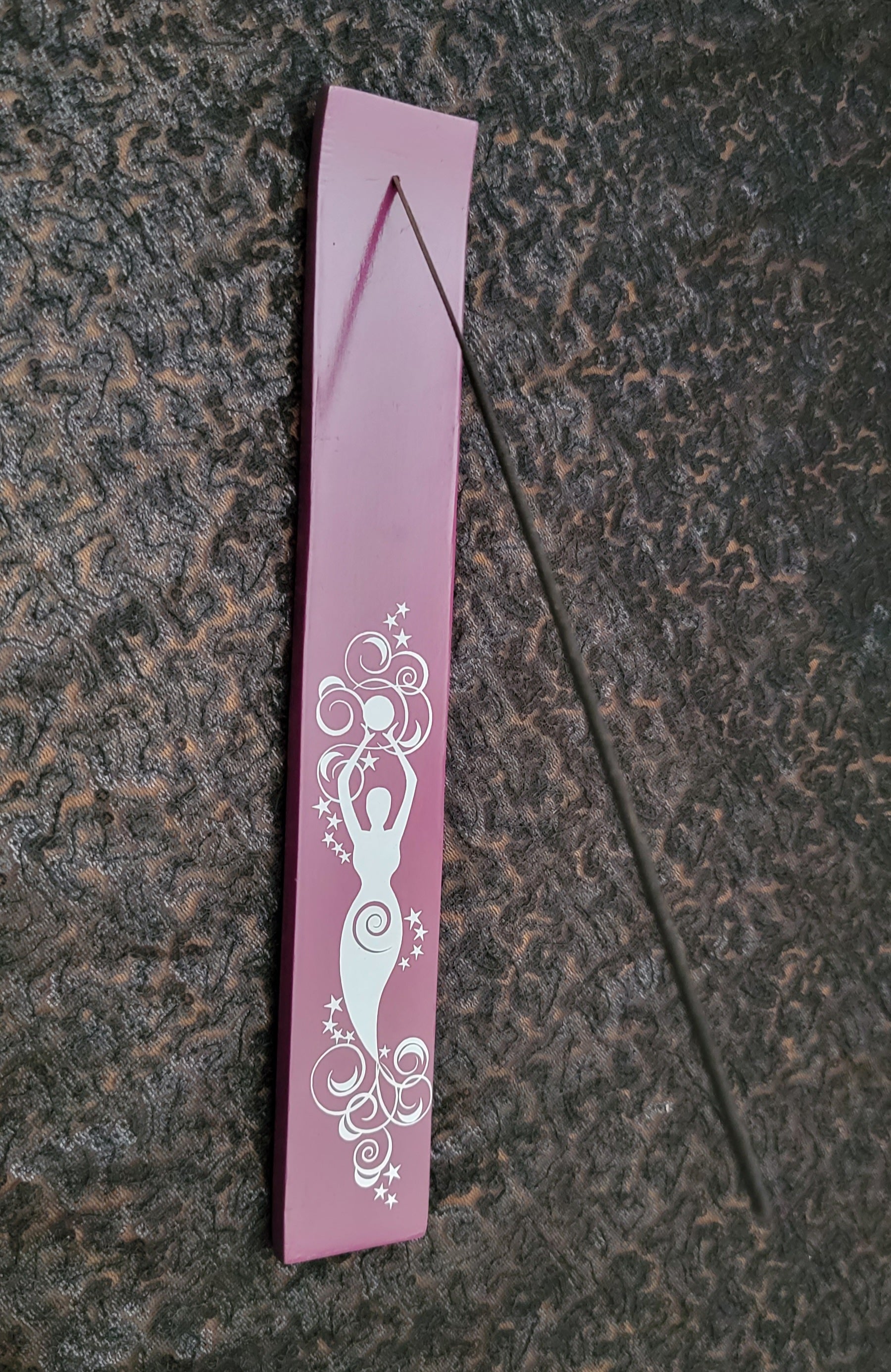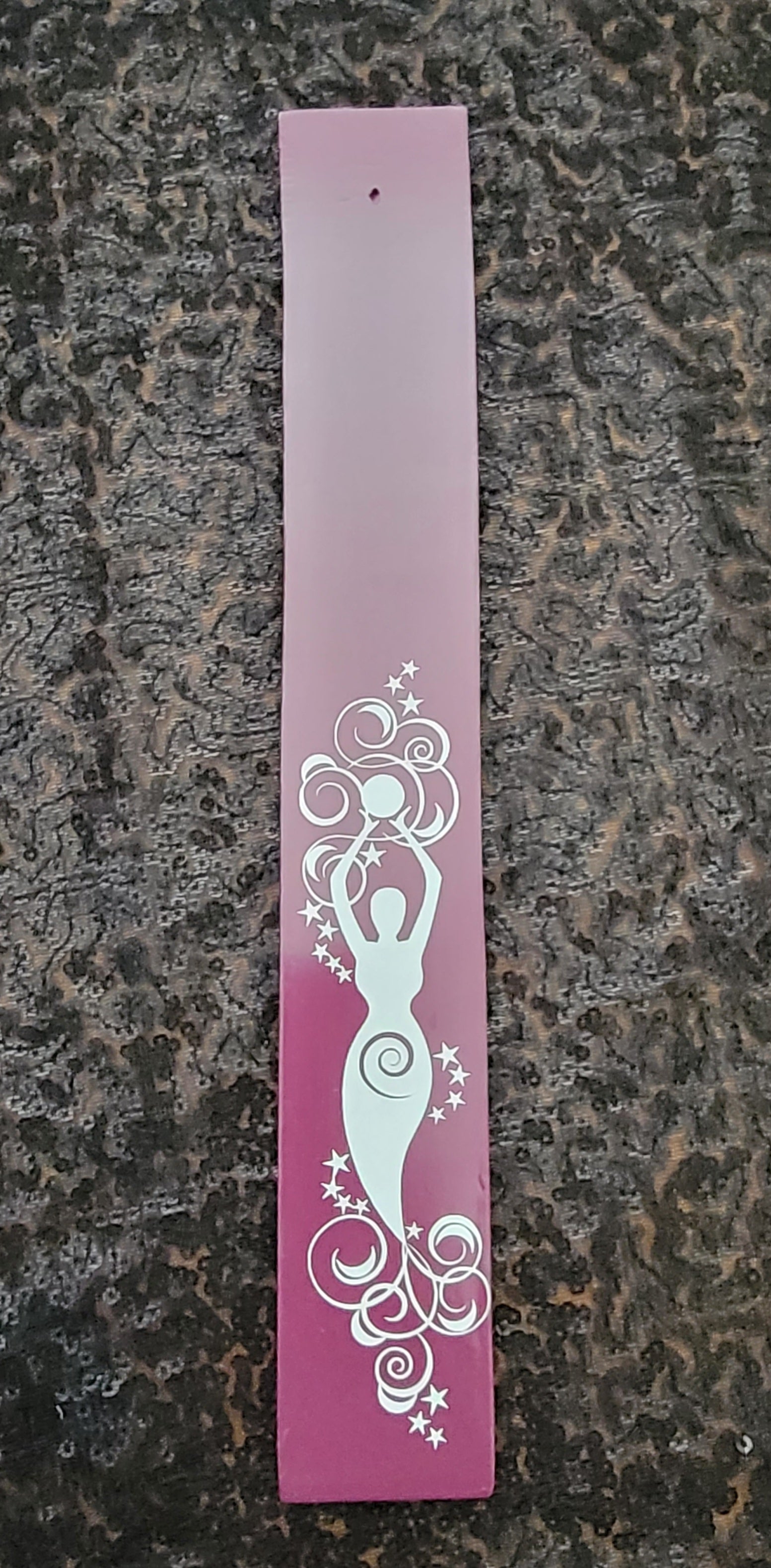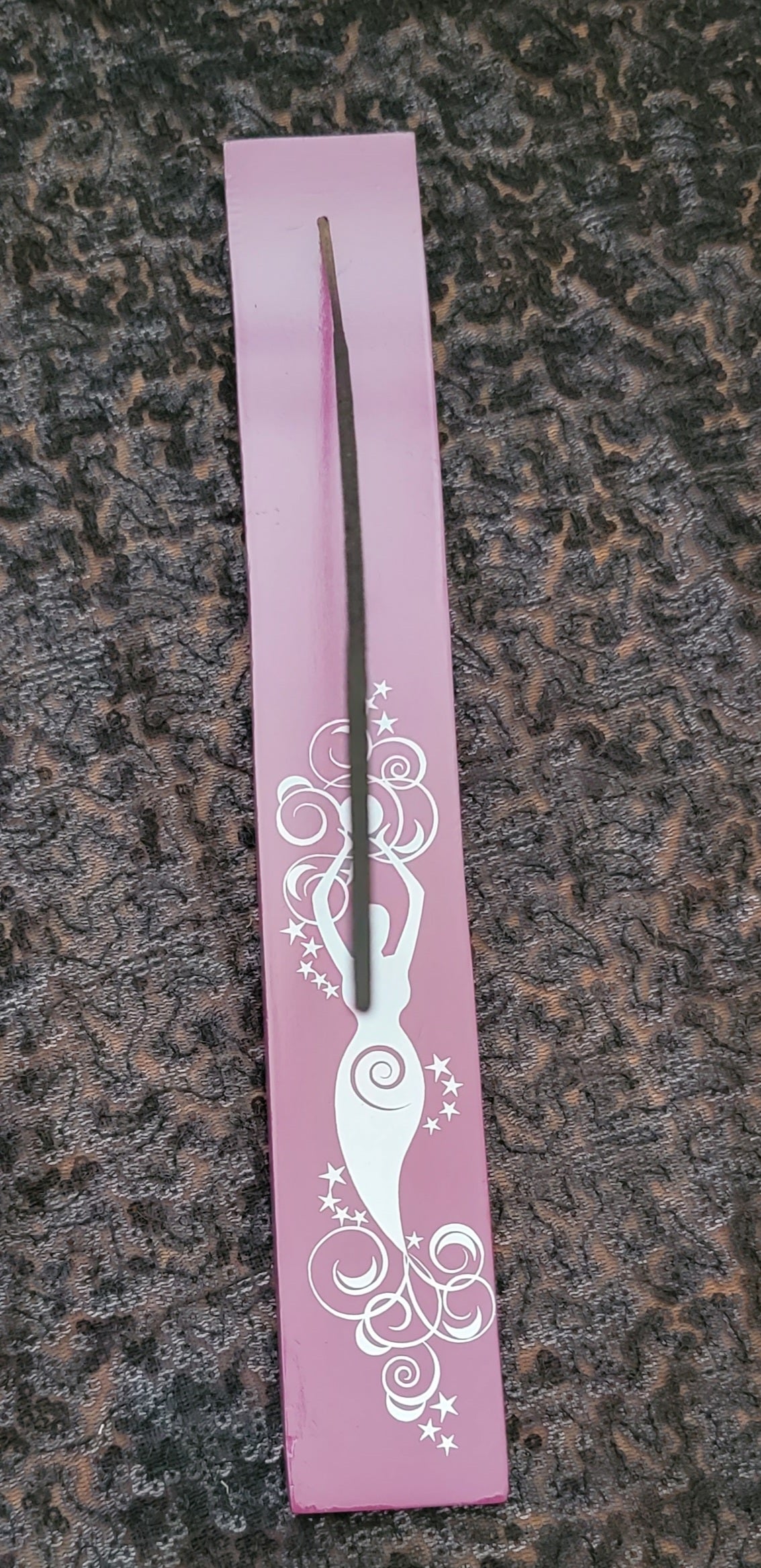 This Goddess Stick Incense Holder is a beautifully crafted wooden accessory painted in a rich purple hue, designed to hold your favorite incense sticks during meditation, rituals, or daily relaxation. Measuring 10" long by 1.5" wide, this elegant incense holder brings sacred feminine energy and style to your spiritual practice.