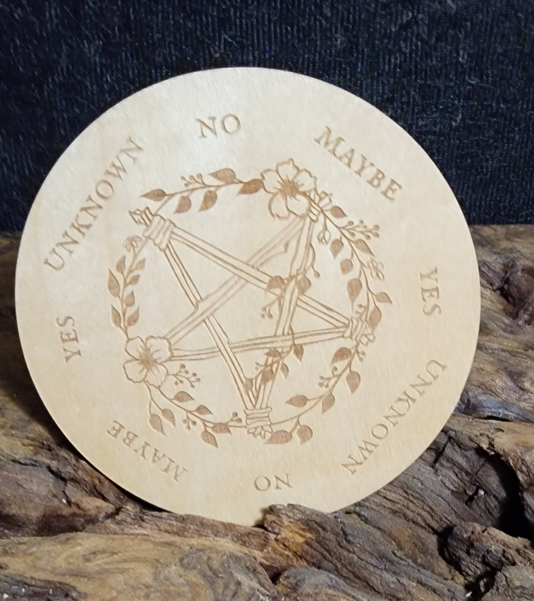 Enhance your pendulum practice with this beautifully engraved 4" wooden pendulum board, featuring a floral pentagram design. This compact and portable tool is perfect for yes/no divination, chakra checking, or spirit communication.