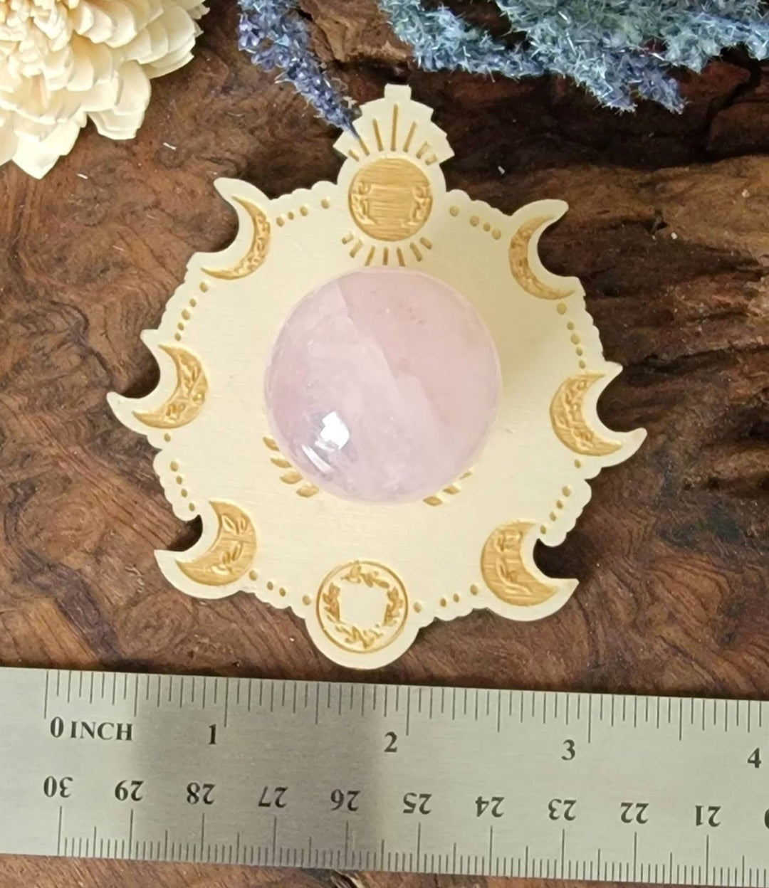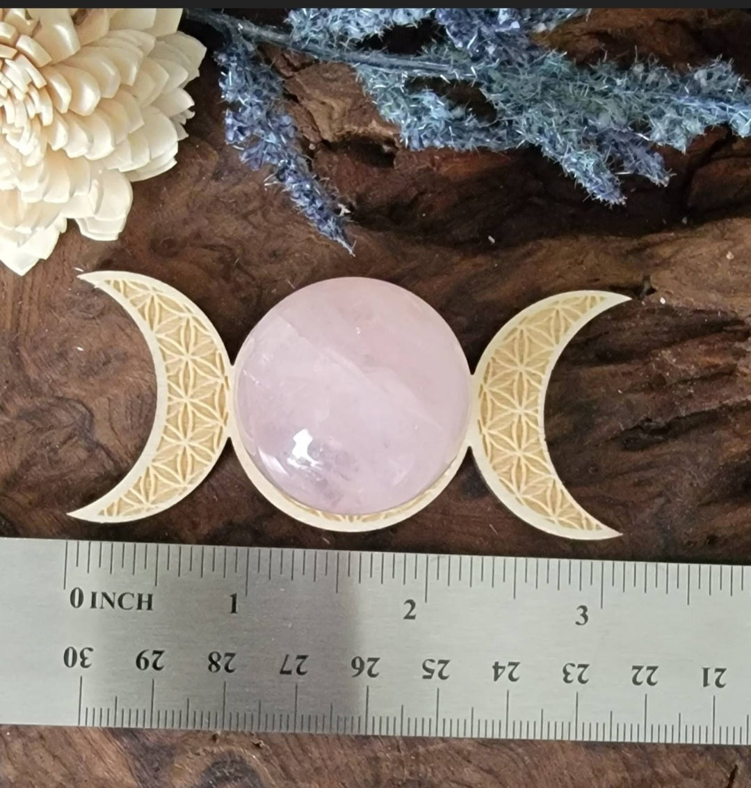 Rose Quartz Crystal Ball with Engraved Wood Stand– Triple Moon or Moon Phase Sphere Stand with Sphere