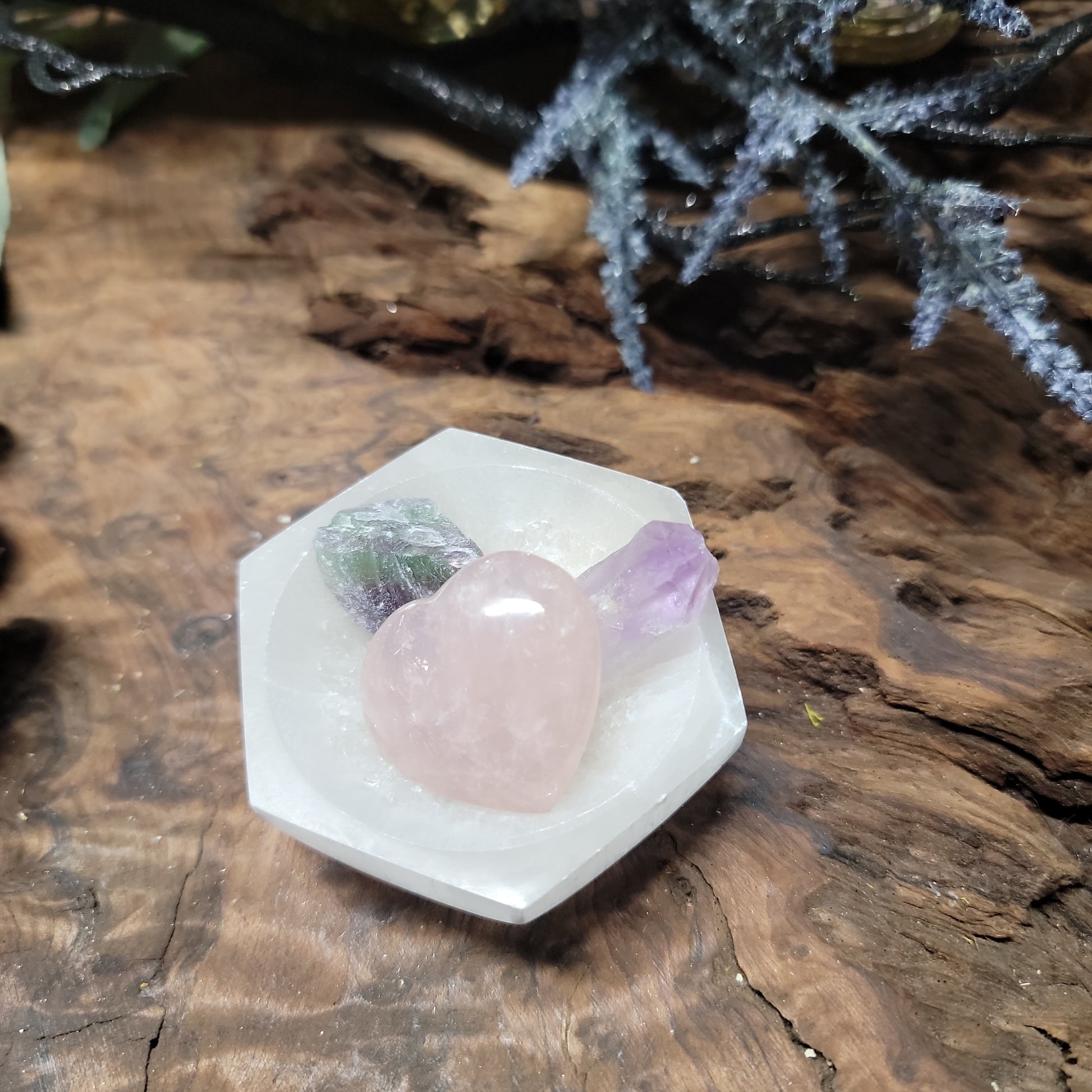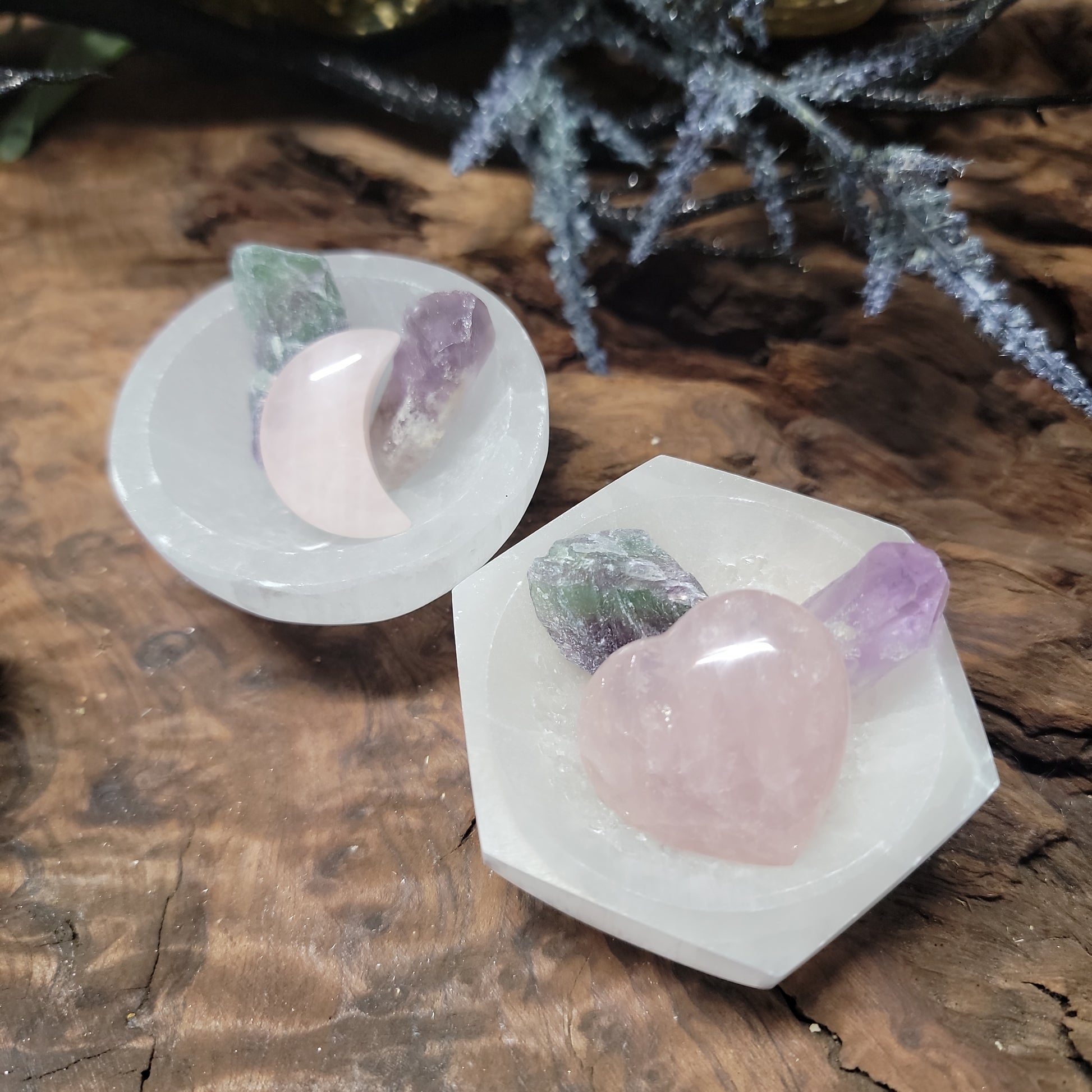 Selenite Self-Love Bowl Set β Rose Quartz, Amethyst & Fluorite