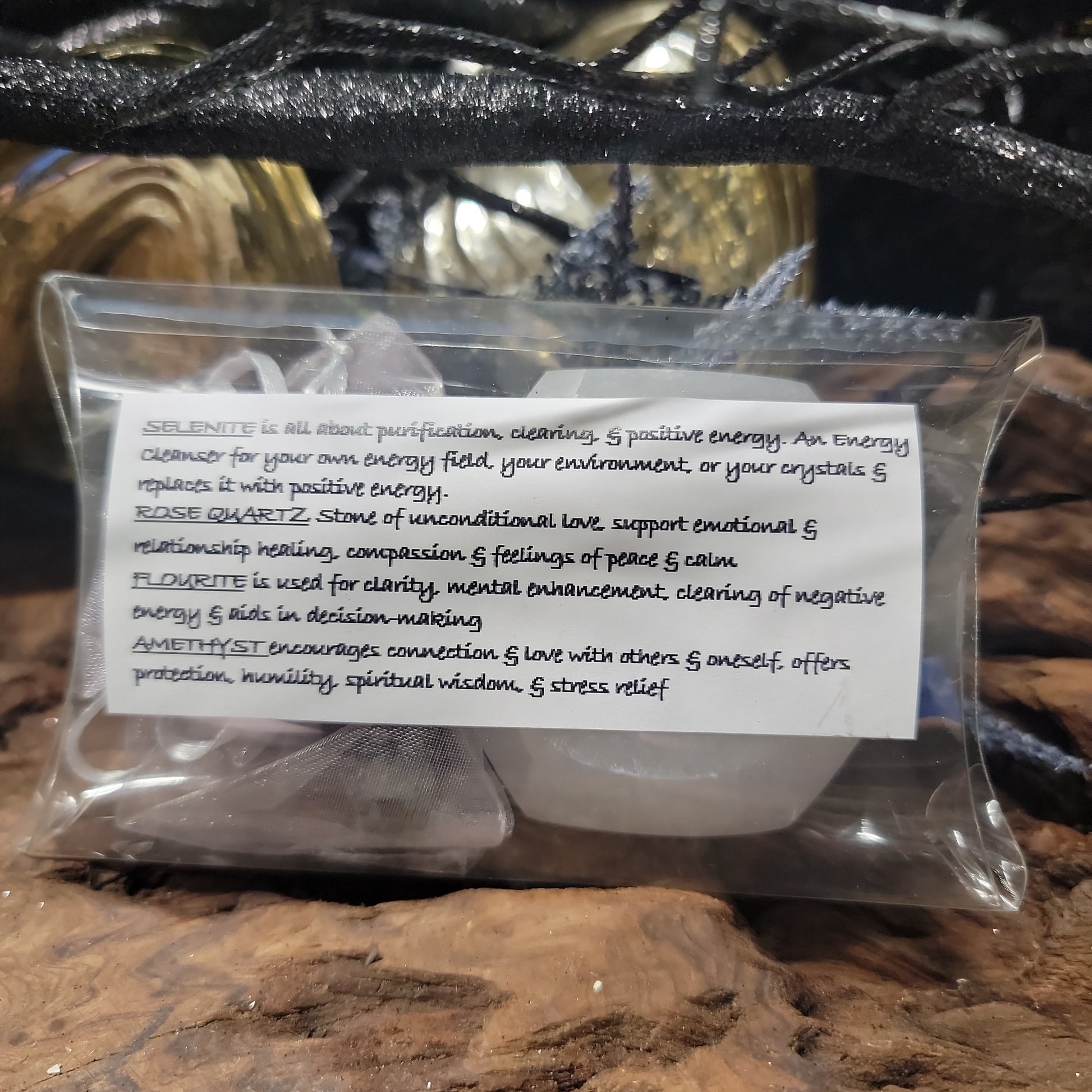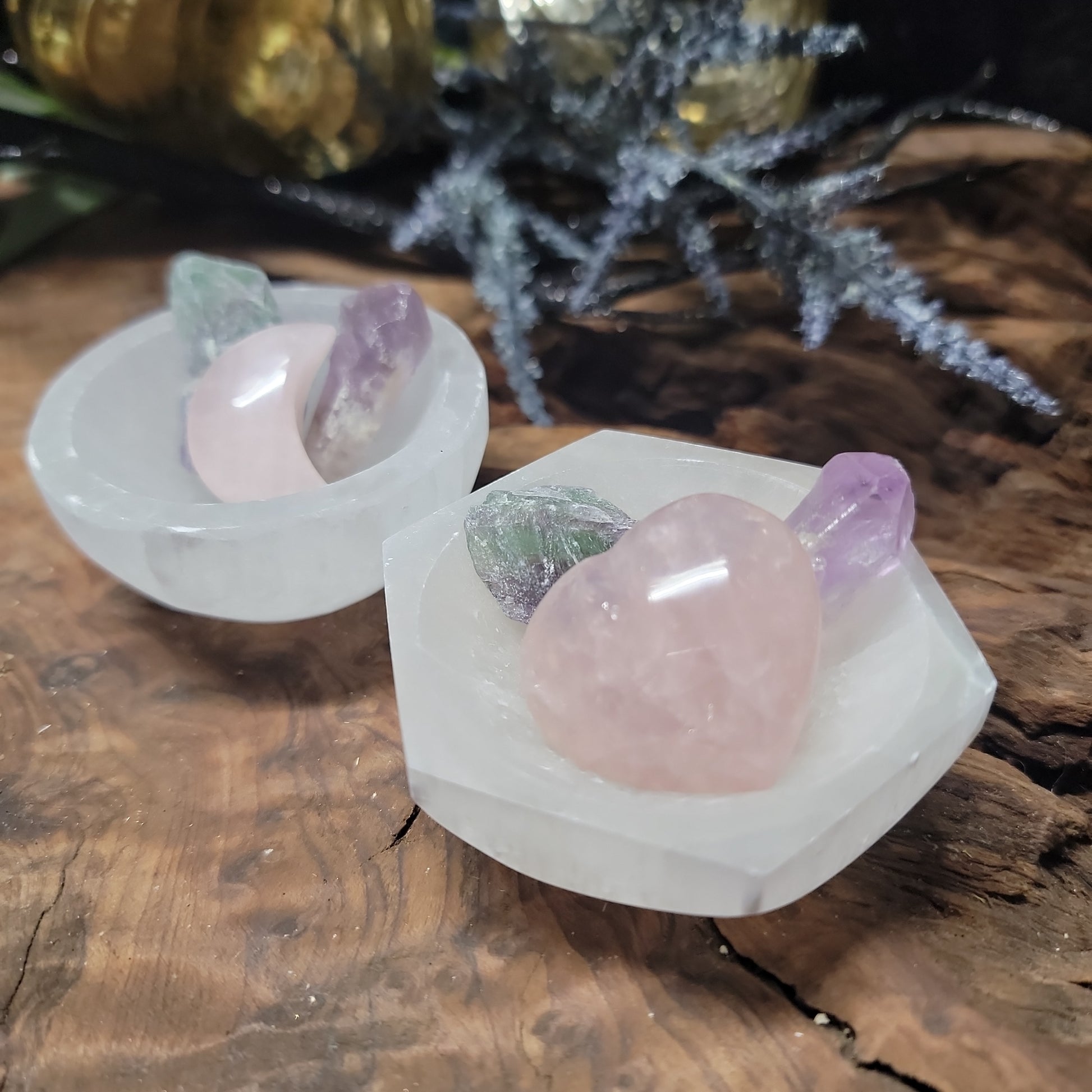 Create a sacred space for self-healing with this lovingly curated Self-Love Selenite Bowl Set, featuring a radiant selenite bowl paired with Rose Quartz, Amethyst, and Fluorite. This combination is ideal for soothing emotional wounds, calming the mind, and nurturing a deep connection to your heart and intuition.