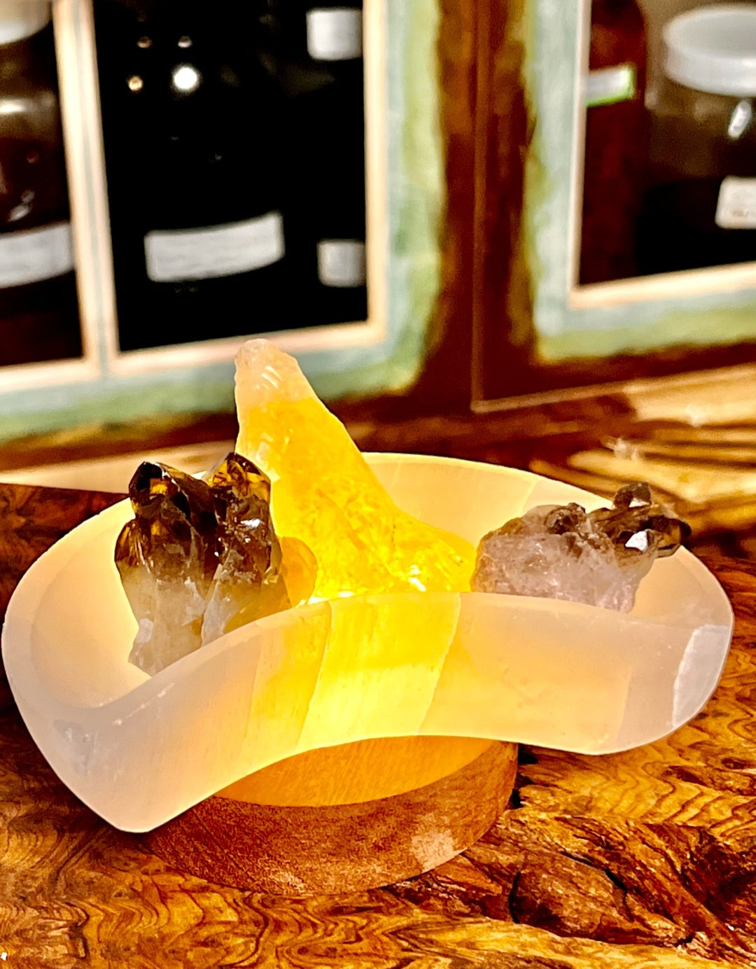 Selenite Moon shaped Bowl Approx 4.5" to 5" Lx 2.5"W. Bowl sold separately, does not include lighted stand or Crystals. * Size may vary due to natural material