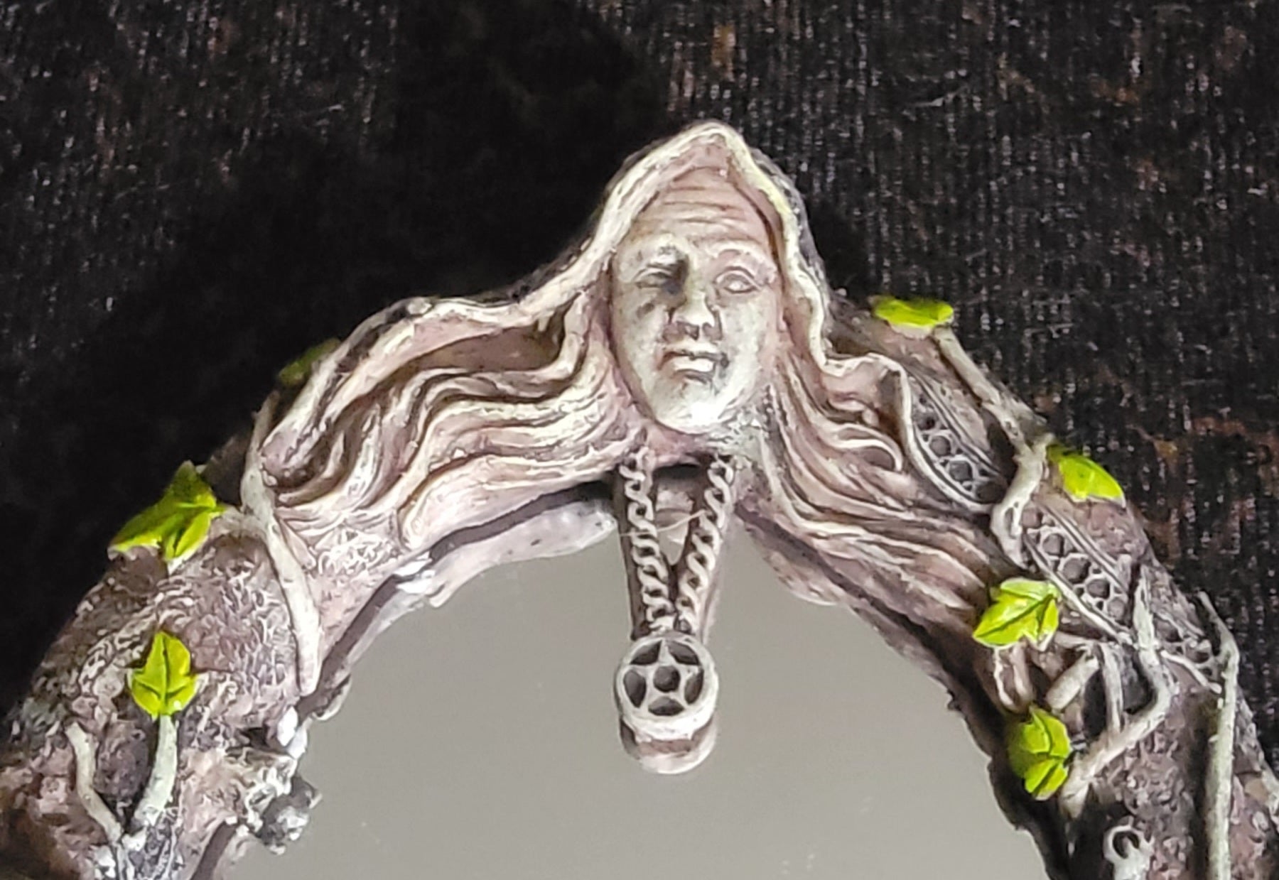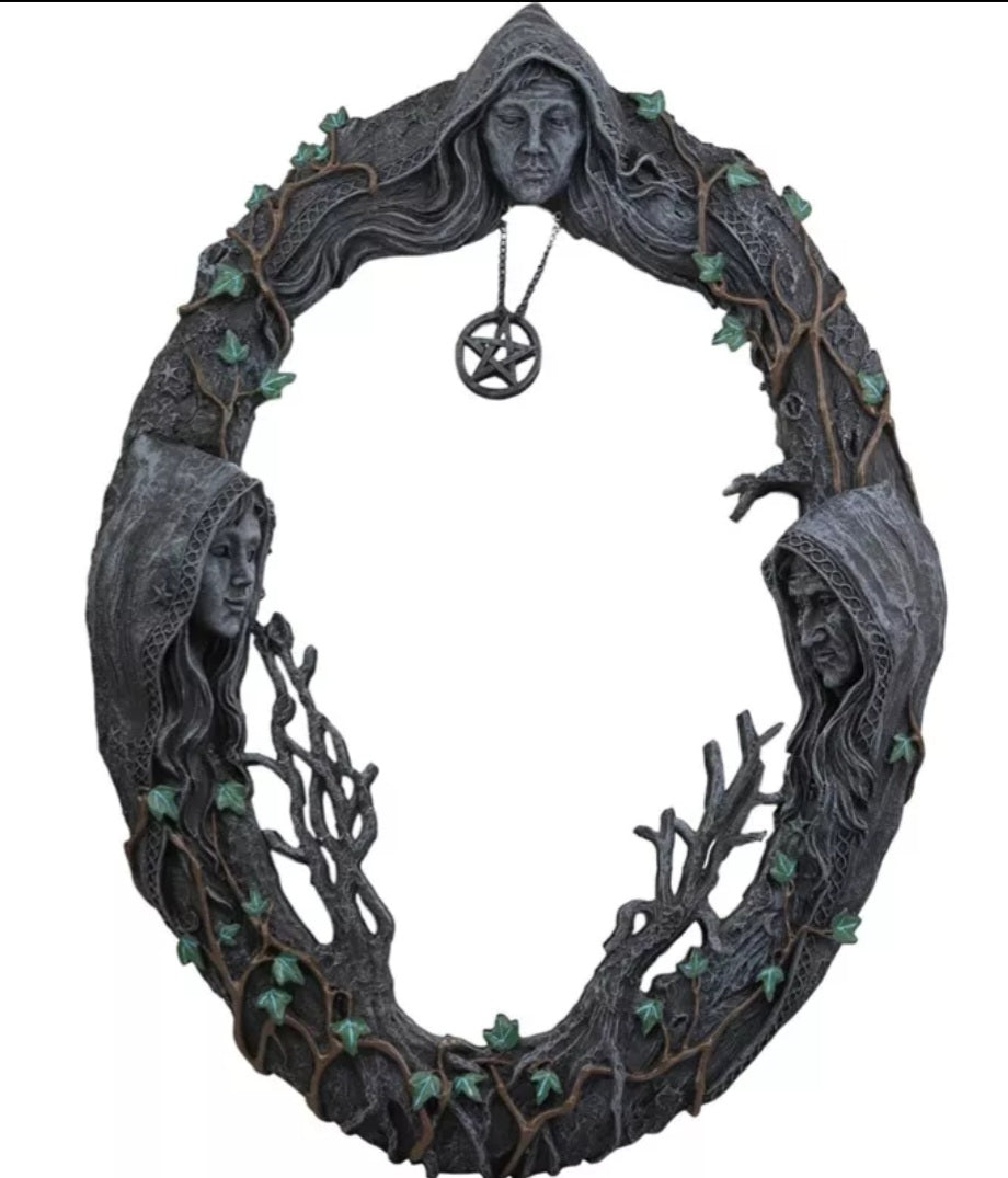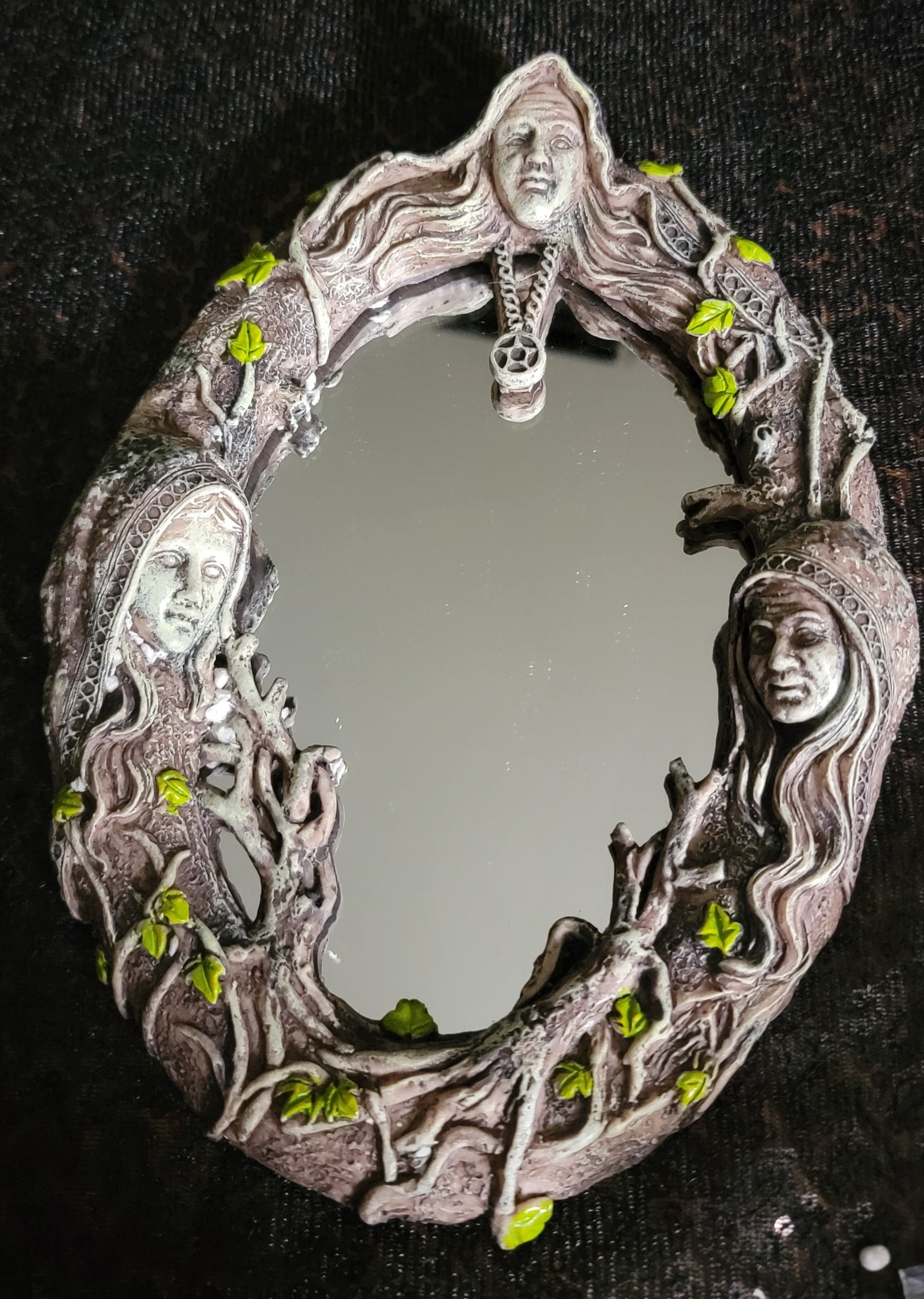 Discover the Triple Moon Goddess Mirror featuring the Mother Maiden Crown design, crafted from resin. Perfect for altar decoration, spiritual practice, or witchy home decor.