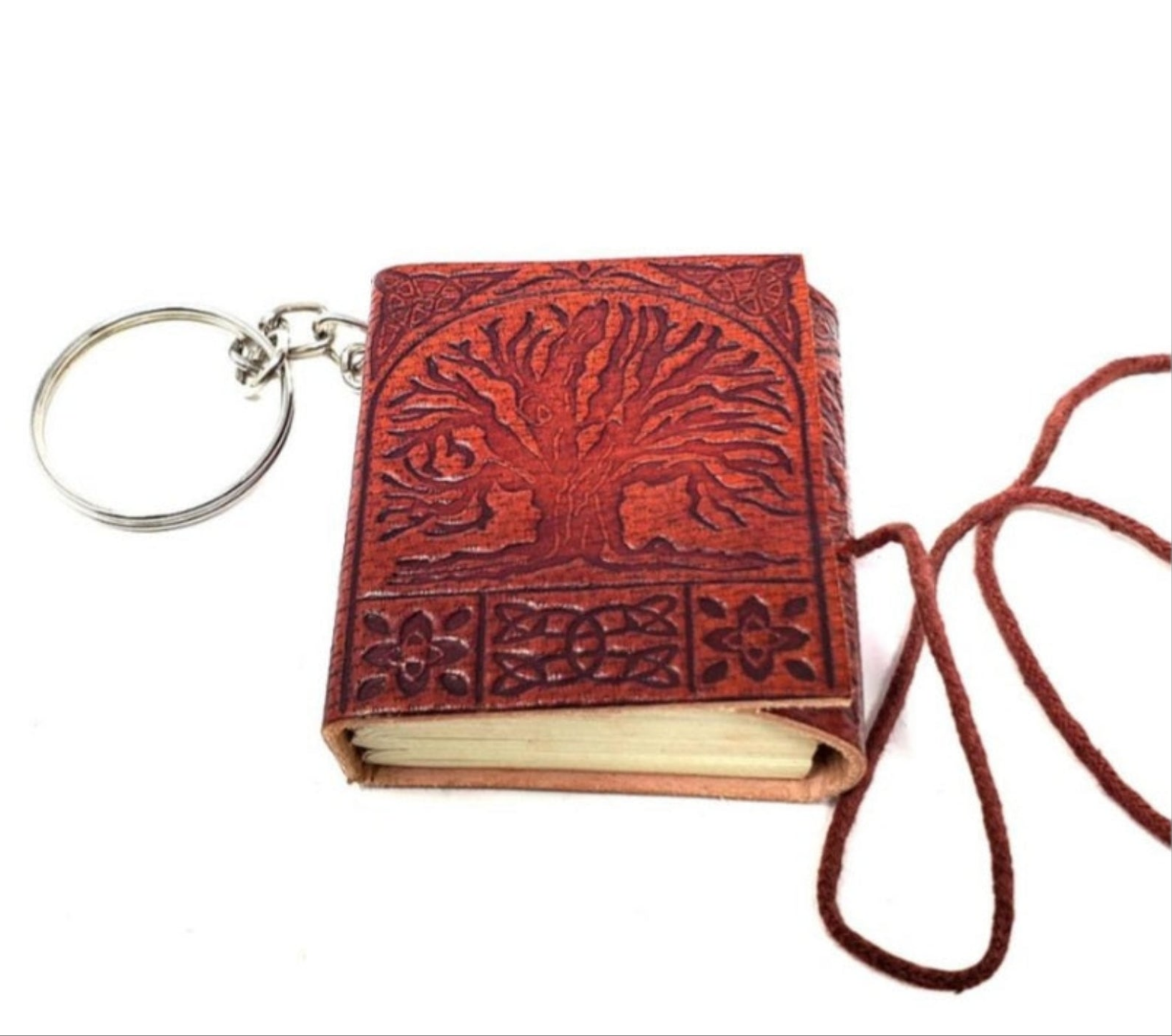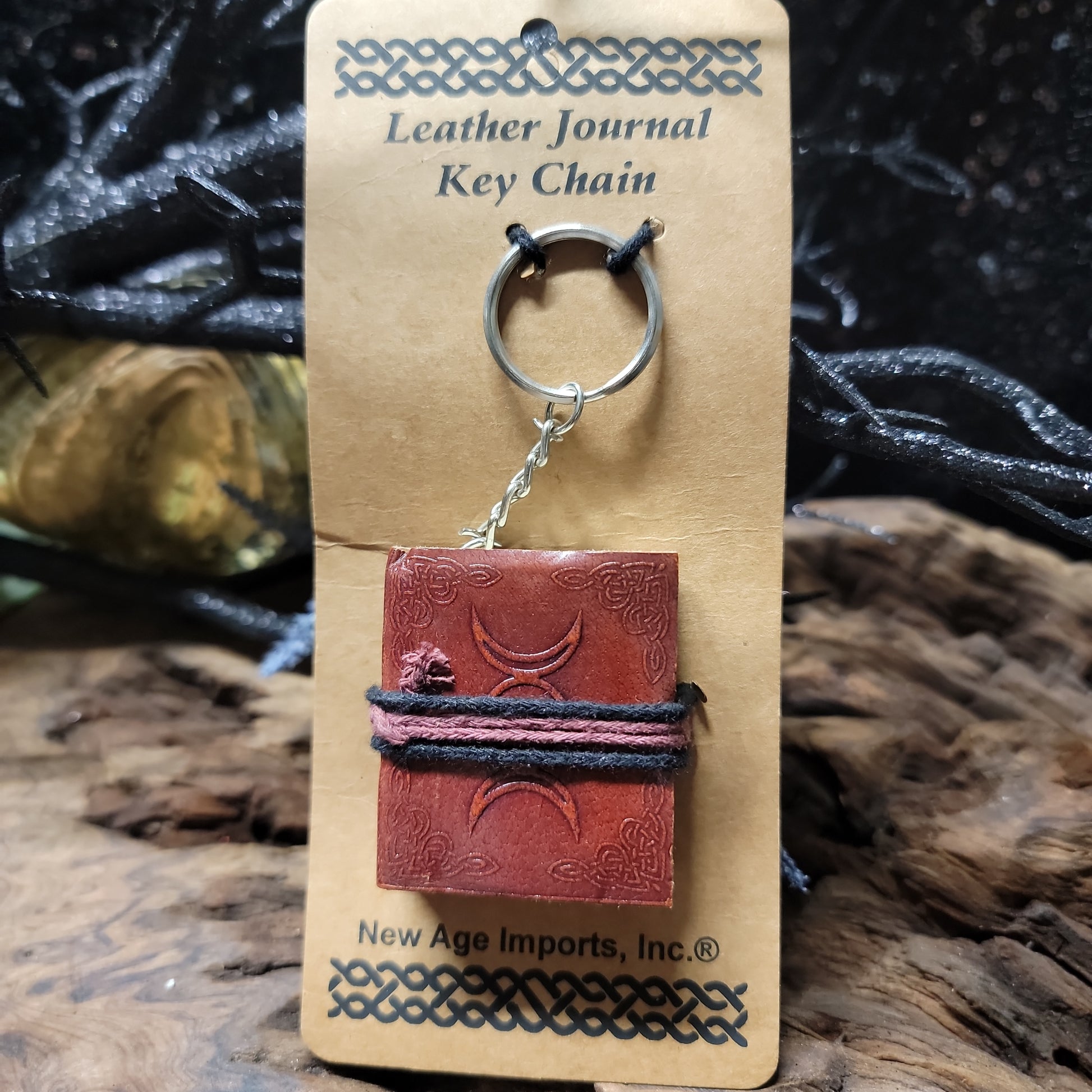 Triple Moon Leather mini Spellbook keychain – Witchcraft Grimoire Key Ring, Pocket Book of Shadows Charm